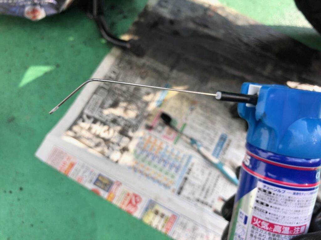 チェーンルブの先端を写真のように”曲げて”おくとチェーンに吹きかける時にやりやすくなりますよ!